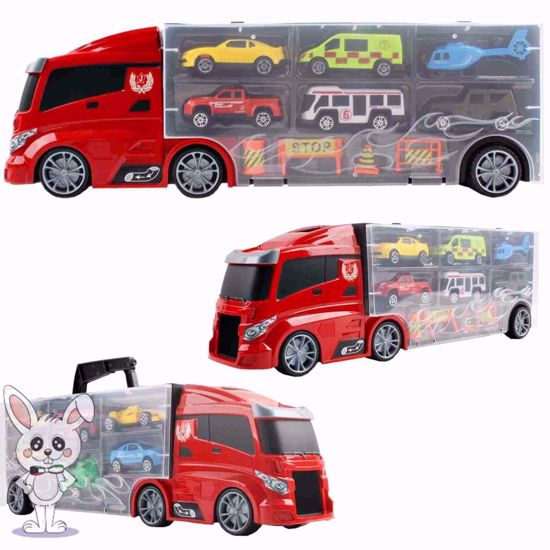 Contents: Transport Truck includes: Variety of Cars, Ambulances, Buses, Helicopters, Stop Sign, Fence, Cone and Barrel. There is even a play map that your child can use to create their own stories and develop their imagination.